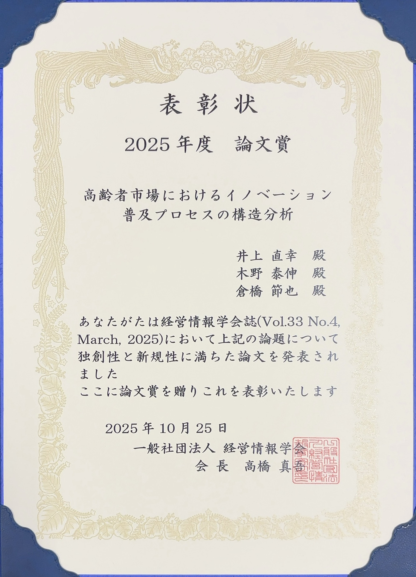 経営学学位プログラム(博士後期課程)の井上直幸氏の論文が経営情報学会論文賞を受賞しました。