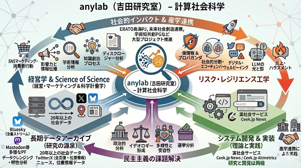 共同研究を積極的に進めています。内容は多岐にわたりますが,特にデータ収集やデータクレンジングで貢献できると思います。お気軽にご連絡下さい。Twitterのサンプルストリーム(全言語:2011年10月~2023年6月,途中欠損あり),位置情報付きツイート(日本国内:2011年5月20日~2023年3月14日,全世界:2014年7月25日~2023年3月14日,ほぼ全てをカバー),公式リツイート(日本語・英語:2013年7月2日~2023年12月28日,その他の言語:2017年6月23日~2023年12月28日),リンク付ツイート(2018年7月23日~2023年12月28日),引用リツイート(日本語:2020年10月22日~2023年11月11日,その他の言語:2020年12月8日~2023年11月11日),ソーシャルグラフ月次観測(2014年1月~,計400万ユーザ程度を定点観測),Blueskyのストリーム(2023年7月9日~,全量),日本語Webニュースデータ(2004年4月~)などのデータを保持しています。